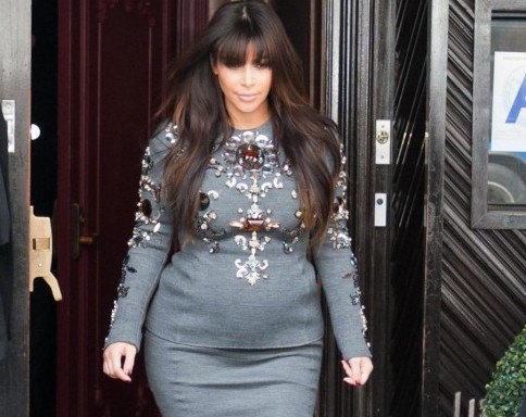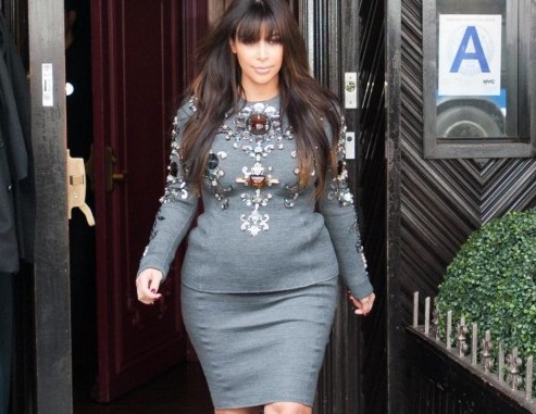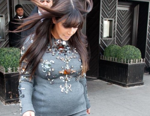 NEW YORK – Dopo essere stata fotografata ieri sera con un tubino dorato che risaltava le forme abbonanti della gravidanza, Kim Kardashian oggi si fa fotografare mentre esce dall’albergo di New York in cui sta alloggiando, con un vestito grigio con dei gioielli cuciti sopra.