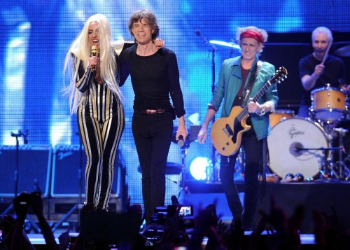Singer Lady Gaga performs with Mick Jagger, center, and Keith Richards of The Rolling Stones at the Prudential Center in Newark, NJ on Saturday, Dec. 15, 2012. (Photo by Evan Agostini/Invision/AP)