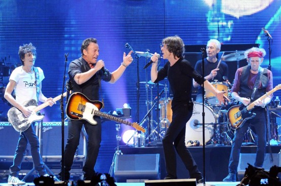 Musician Bruce Springsteen, center left, performs with, from left, Ronnie Wood, Mick Jagger, Charlie Watts and Keith Richards of The Rolling Stones at the Prudential Center in Newark, NJ on Saturday, Dec. 15, 2012. (Photo by Evan Agostini/Invision/AP)