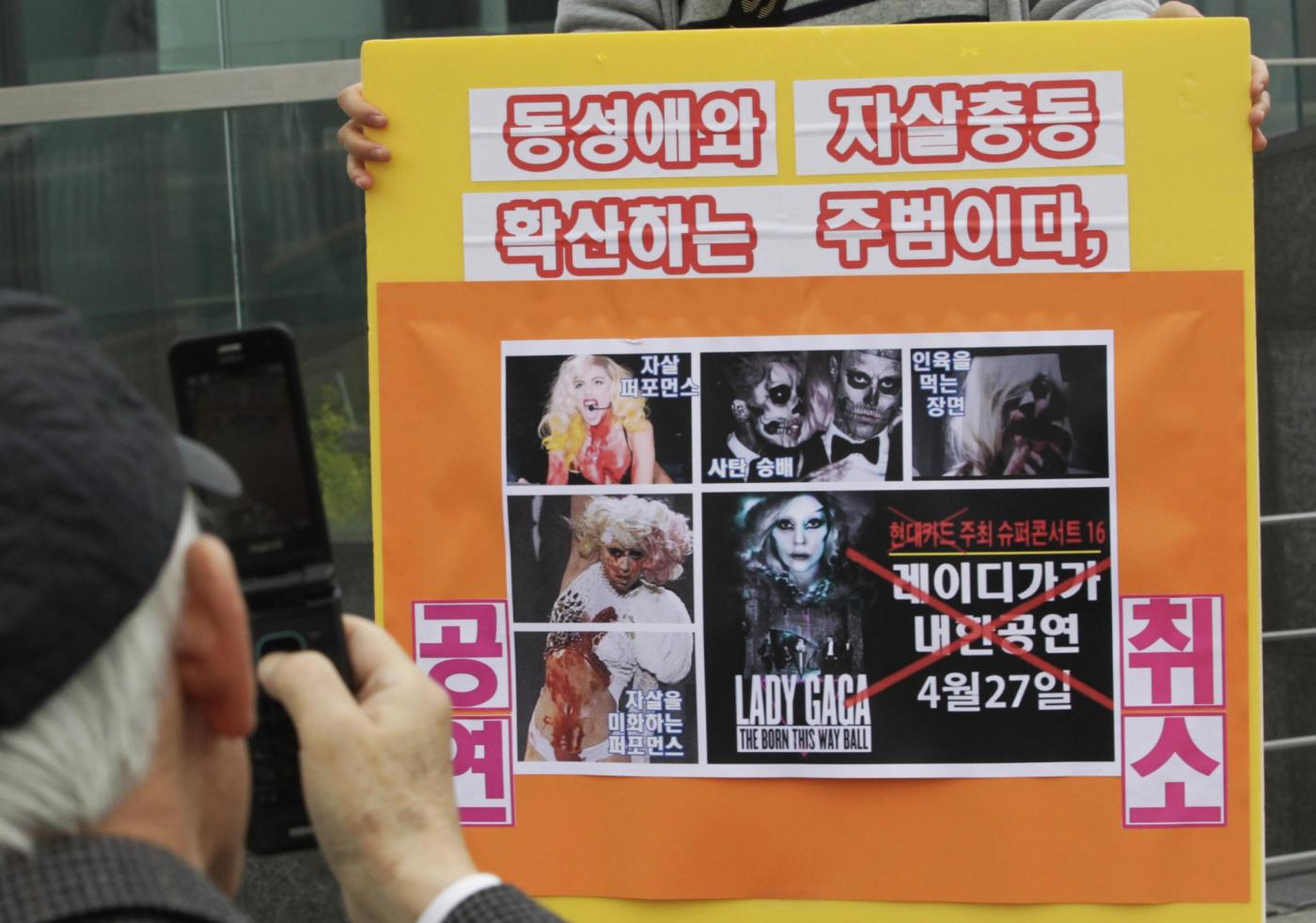 A South Korean man takes pictures of a picket showing U.S. pop star Lady Gaga as a Christian stages a protest to call for the cancellation of her concert, in Seoul, South Korea, Monday, April 23, 2012. Lady Gaga's April 27 concert in Seoul was banned to over-18s by the Korea Media Rating Board as Gender Equality Ministry considers one of her songs to be performed at the show as "inappropriate" for minors. The letters read " Cancellation of a concert (AP Photo/Ahn Young-joon)