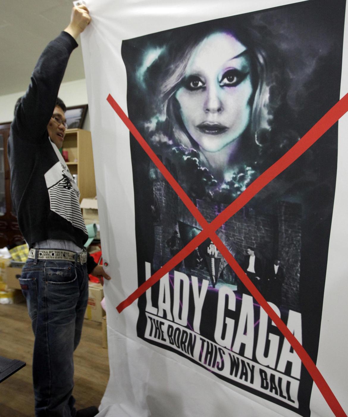 A civic group member hangs a banner showing a defaced picture of U.S. pop star Lady Gaga on a wall to call for the cancellation of her concert, in Seoul, South Korea, Monday, April 23, 2012. Lady Gaga's April 27 concert in Seoul is being banned to minors under the age of 18 by the Korea Media Rating Board, as the Gender Equality Ministry considers one of her songs to be performed at the show as "inappropriate" for minors. (AP Photo/Ahn Young-joon)