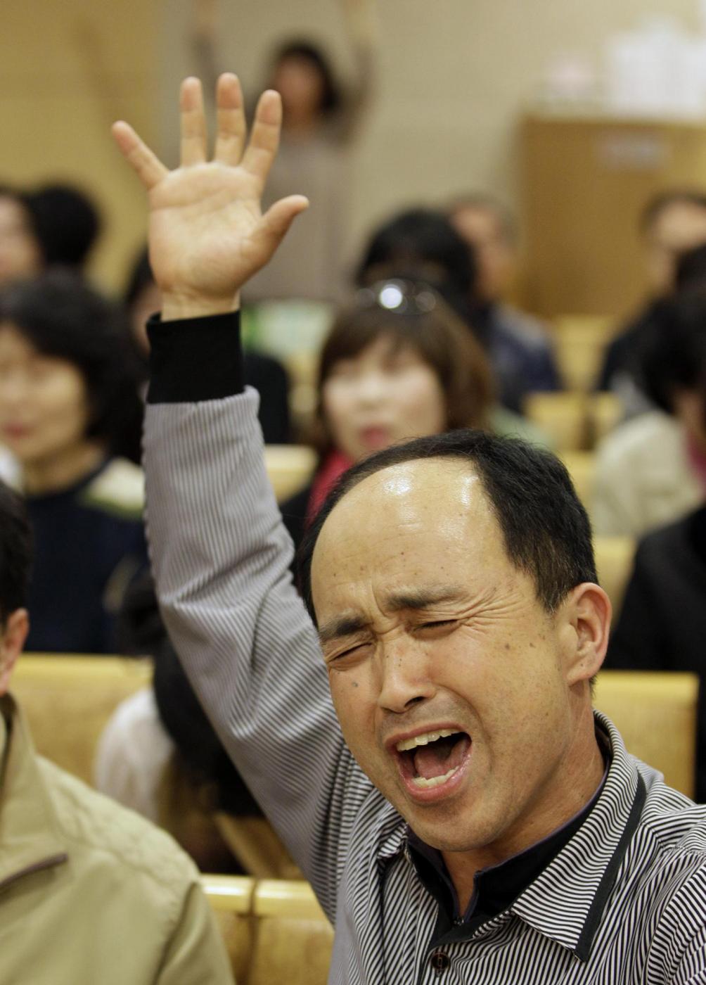 A South Korean Christian prays during a service as they call for the cancellation of a concert of U.S. pop star Lady Gaga at a church in Seoul, South Korea, Sunday, April 22, 2012. Lady Gaga's April 27 concert in Seoul was banned to over-18s by the Korea Media Rating Board as Gender Equality Ministry considers one of her songs to be performed at the show as "inappropriate" for minors. (AP Photo/Lee Jin-man)