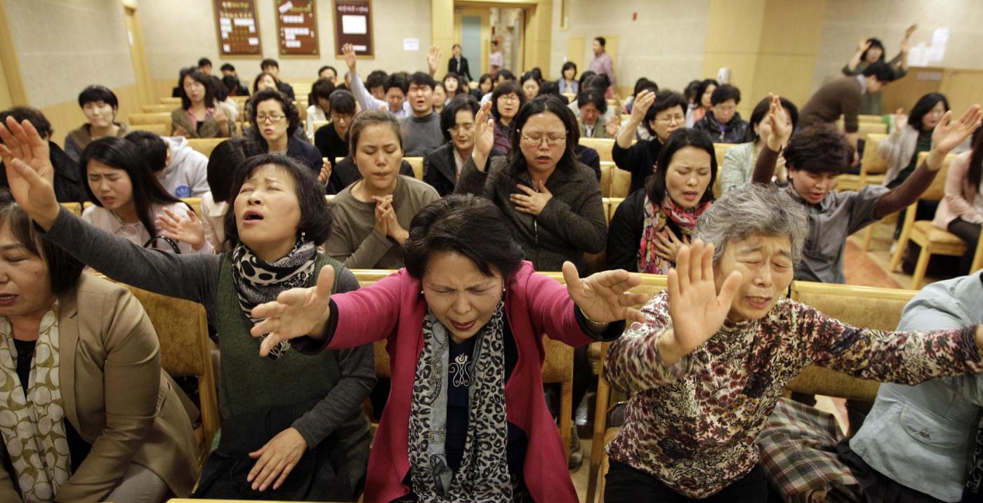 South Korean Christians pray during a service as they call for the cancellation of a concert of U.S. pop star Lady Gaga at a church in Seoul, South Korea, Sunday, April 22, 2012. Lady Gaga's April 27 concert in Seoul was banned to over-18s by the Korea Media Rating Board as Gender Equality Ministry considers one of her songs to be performed at the show as "inappropriate" for minors. (AP Photo/Lee Jin-man)