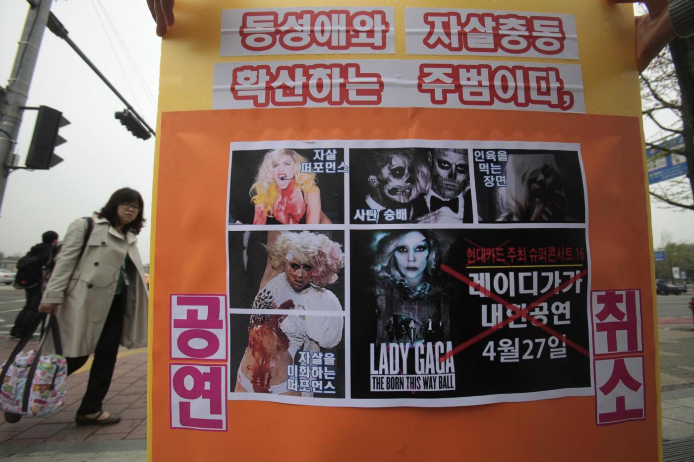 A chiedere la cancellazione della tappa coreana, sarebbe la confessione protestante “alleanza per una cultura sana in materia di sessualità”. L’organizzazione si è prodigata a distribuire decine i volantini contro la cantante, esplicitamente accusata di “promuovere una cultura sessuale malsana attraverso discorsi e concerti osceni”. I cristiani conservatori, oltre ai volantini hanno appeso manifesti al muro che sono stati poi rimossi e hanno organizzato una messa (vedi le immagini qui di seguito).