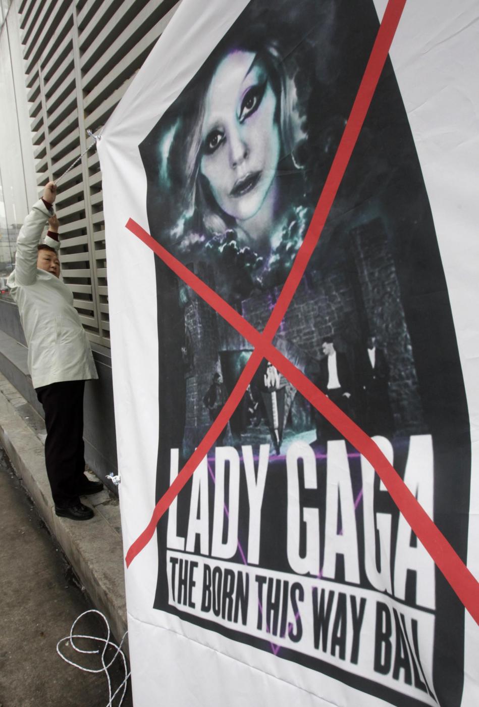 A Christian holds a demonstration showing pictures of U.S. pop star Lady Gaga to call for the cancellation of her concert, in Seoul, South Korea, Monday, April 23, 2012. Lady Gaga's April 27 concert in Seoul is being banned to minors under the age of 18 by the Korea Media Rating Board, as the Gender Equality Ministry considers one of her songs to be performed at the show as "inappropriate" for minors. The letters read" Cancellation of a concert. (AP Photo/Ahn Young-joon)