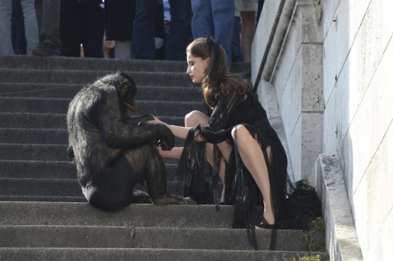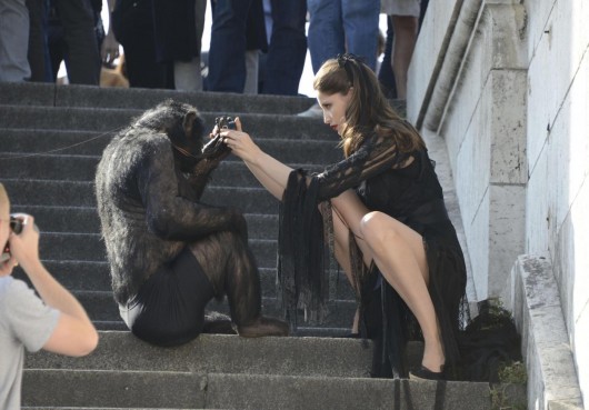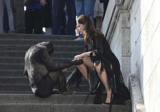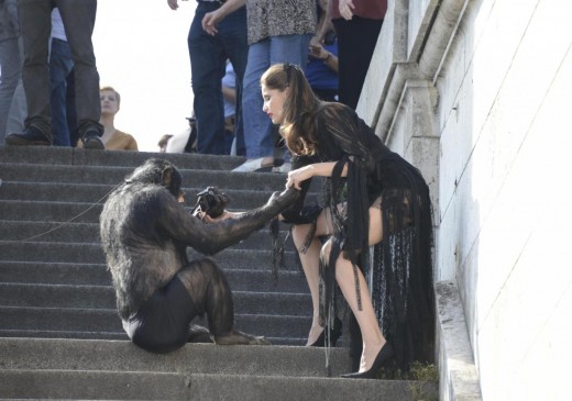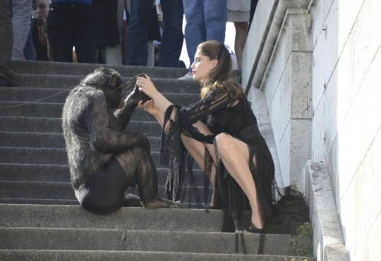 Laetitia Casta posing with a chimpanzee during a photo session on the 'Alexandre III' bridge in Paris, France on September 16, 2012. LaPresseOnly ItalyNO CREDIT # 335146_044