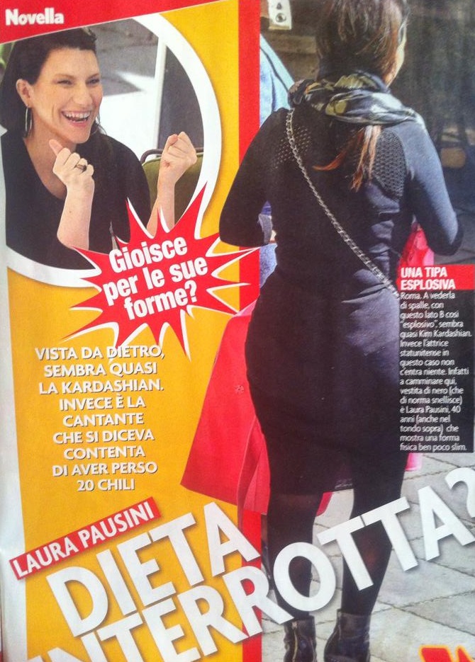 “Vista da dietro – scrive Novella 2000 – Laura Pausini sembra Kim Kardashian“. A vederla di spalle, con questo lato B così esplosivo – punzecchia il giornale di gossip – “sembra quasi Kim Kardashian. Invece l’attrice statunitense in questo caso non c’entra niente. Infatti a camminare qui, vestita di nero – che di norma snellisce – è Laura Pausini”.