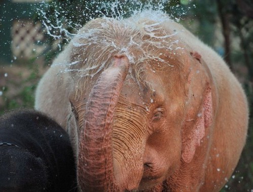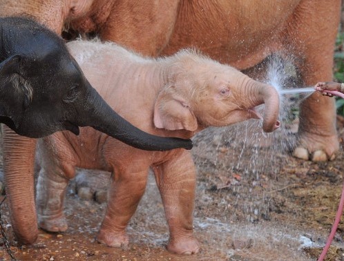Mamma elefante e il suo cucciolo sono contenti: dopo questo speciale “trattamento” la loro pelle, da bruno – rossastra che era, torna ad essere rosa chiaro.