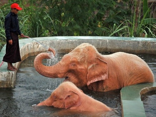 NAYPYIDAW (BIRMANIA) – Le immagini che seguono, mostrano alcuni simpatici elefanti rosa dello zoo birmano di Naypyidaw che vengono lavati dagli inservienti.