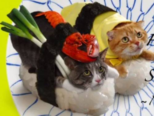 TOKYO – In Giappone, alcuni gatti sono stati “photoshoppati” avvolti nelle verdure e servito insieme a riso e sushi. La realizzazione è della Tange & Nakimushi Peanuts, azienda giapponese che sostiene che “il gatto sushi” (“Neko-Sushi”) sia stata un’antica creatura mistica.