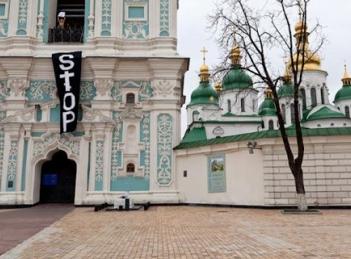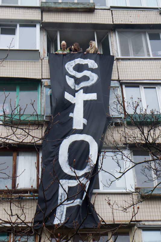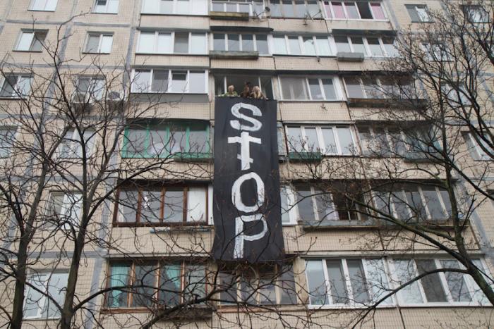 Le immagini dell’occupazione e della preparazione della protesta. Lo striscione infatti, prima di essere stato esposto sulla cattedrale è stato mostrato dalle finestre di una palazzina di Kiev: