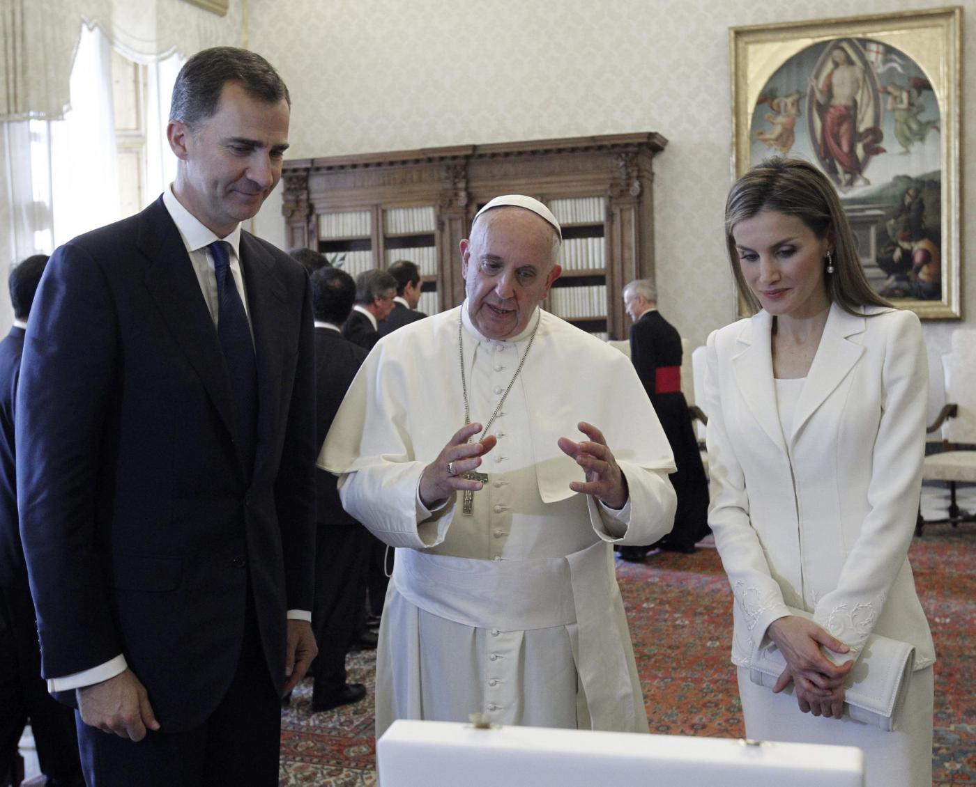 Spain's King Felipe VI (L) and Queen Letizia (R) are granted a private audience by Pope Francis (C) at Vatican city, Vatican, 30 June 2014, in the first official visit of the Spanish Royal Couple outside Spain. EFE/Sergio Barrenechea