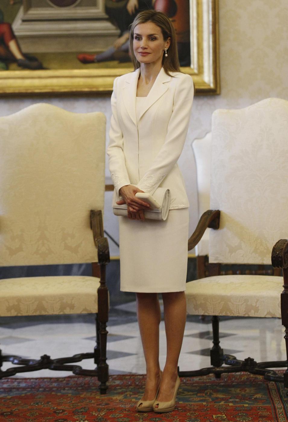 Per Letizia vale un antico privilegio, chiamato “privilegio del bianco“: solo le regine cattoliche, per tradizione, possono indossare il bianco quando incontrano il pontefice. Un privilegio che oggi possono vantare anche la regina Mathilde del Belgio, l’ex regina Sofia di Spagna, l’ex regina Paola del Belgio, l’ex regina Fabiola del Belgio e la granduchessa Maria Teresa del Lussemburgo.