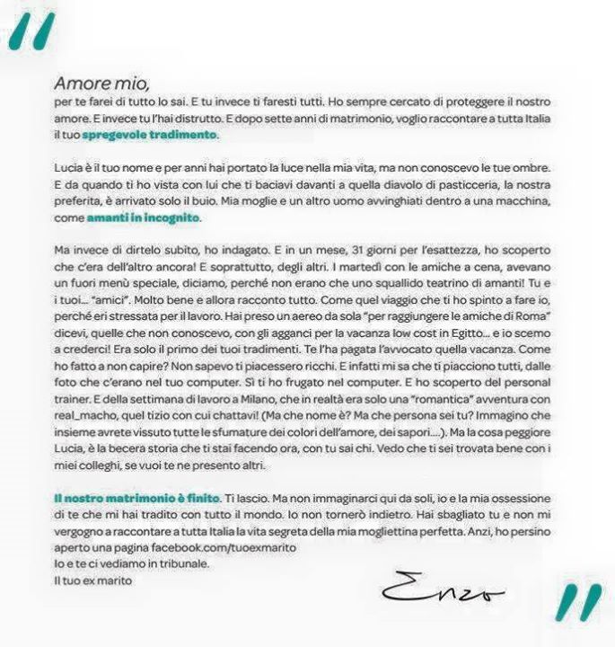 “Il nostro matrimonio – scrive Enzo a fine lettera – è finito. Ti lascio. Ma non immaginarci qui da soli, io e la mia ossessione di te che mi hai tradito con tutto il mondo. Io non tornerò indietro. Hai sbagliato tu e non mi vergogno a raccontare a tutta Italia la vita segreta della mia mogliettina perfetta. Anzi, ho persino aperto una pagina facebook. Io e te ci vediamo in tribunale. Il tuo ex marito”