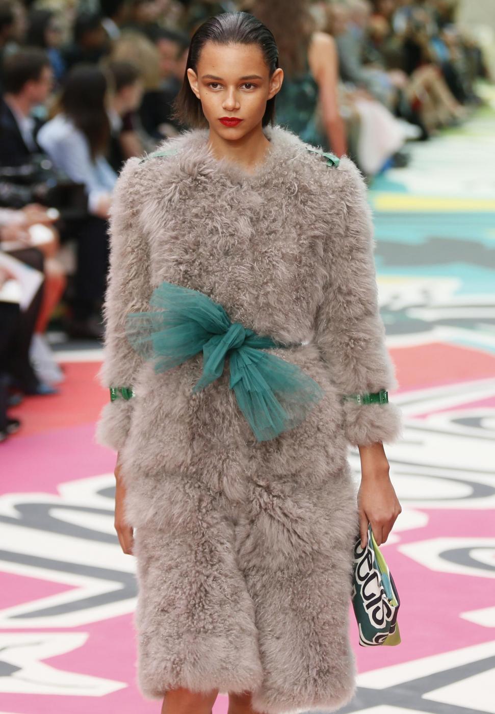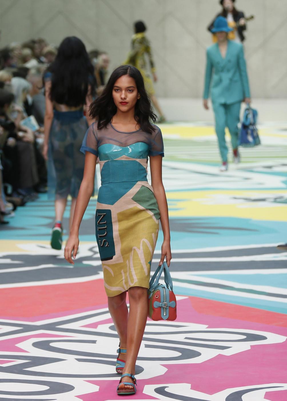 A model wears an outfit by designer Burberry Prorsum during their Spring/Summer 15 show at London Fashion Week in London, Monday, Sept. 15, 2014. (AP Photo/Alastair Grant)