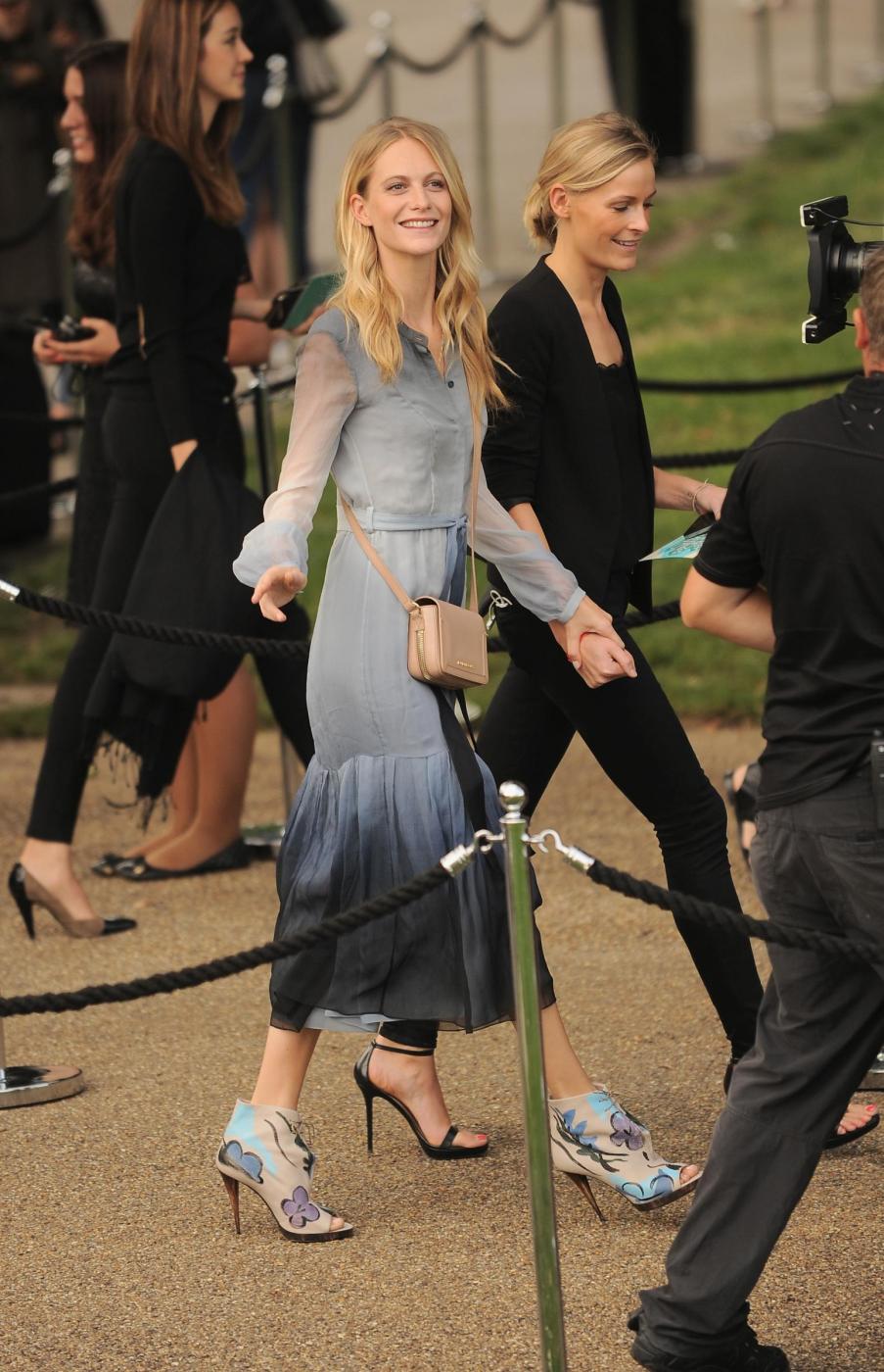 In prima fila nel parterre le modelle Kate Moss e Cara Delevingne, che si sono presentate alla sfilata mano nella mano. Per l’occasione Cara ha indossato un completo giacca e pantalone color petrolio, senza camicia né reggiseno, abbinati a sneakers basse con lacci rossi . Kate ha optato invece per impermeabile, pantalone, occhiali scuri e sandali verdi con tacco.