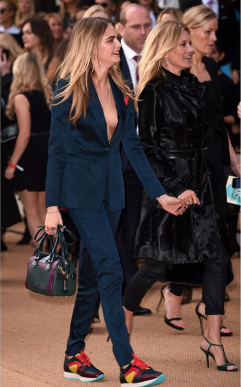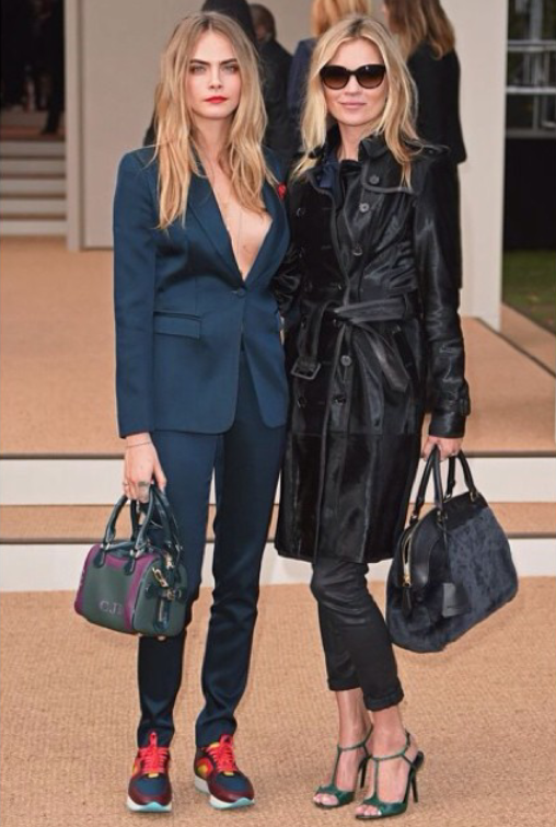LONDRA – Kate Moss e Cara Delevingne mano nella mano: così si sono presentate le due modelle alla sfilata di Burberry, durante la settimana della moda londinese. Per l’occasione Cara ha indossato un completo giacca e pantalone color petrolio, senza camicia né reggiseno, abbinati a sneakers basse con lacci rossi . Kate ha optato invece per impermeabile, pantalone, occhiali scuri e sandali verdi con tacco.
