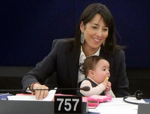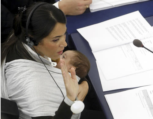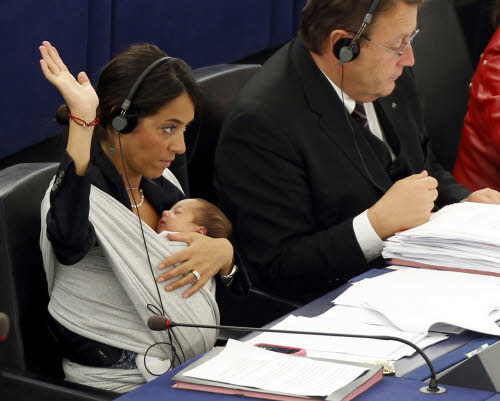 Italian European Parliament member Licia Ronzulli votes with her baby on the maternity leave bill at the European Parliament in Strasbourg eastern France during the debate on maternity leave, Wednesday Oct20, 2010 in Strasbourg, eastern France. Minimum maternity leave in the EU should be extended from 14 to 20 weeks with full pay, with some flexibility for countries which already have a form of family-related leave, the European Parliament decided on Wednesday. (AP Photo/Christian Lutz)