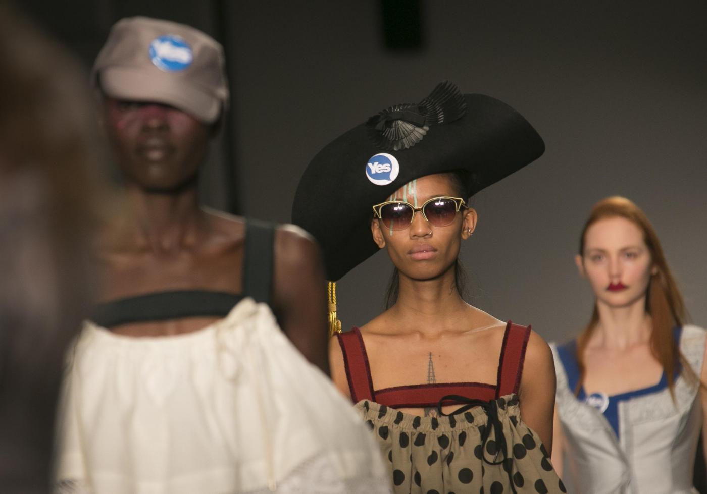Foto: La PresseA model wears an outfit by designers Hunter Original during their Spring/Summer 2015 show at London Fashion Week in London, Saturday, Sept. 13, 2014. (AP Photo/Alastair Grant)
