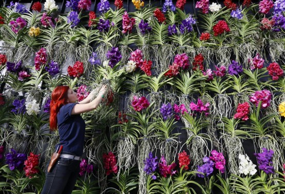 Horticulturist Elisa Biondi works on a display of vanda orchids at Kew Royal Botanic Gardens in London, Thursday, Feb. 7, 2013. Over 4,500 orchids are being displayed for an Orchid festival as well as 550 bromeliads and 350 assorted foliage plants. (AP Photo/Kirsty Wigglesworth)