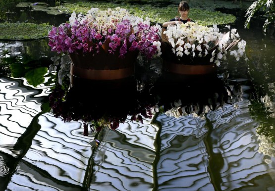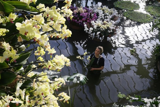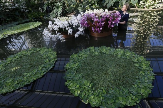 A horticulturist works on a display of orchids at Kew Royal Botanic Gardens in London, Thursday, Feb. 7, 2013. Over 4,500 orchids are being displayed for an Orchid festival as well as 550 bromeliads and 350 assorted foliage plants. (AP Photo/Kirsty Wigglesworth)