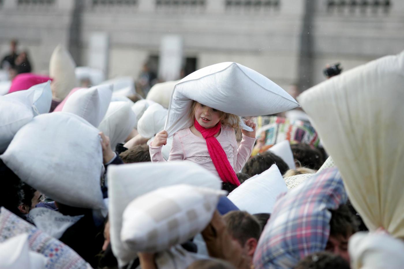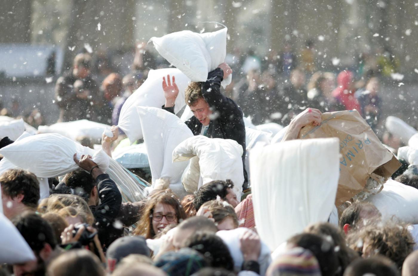 Il Pillow Fight Day viene organizzato ogni anno in diverse città del mondo, tra cui San Paolo, Barcellona e Toronto. Armati di morbidi cuscini, giovani e meno giovani vengono coinvolti in una lotta a suon di piume. Ad organizzare l’evento a livello mondiale è la Urban Playground Movement con lo scopo di coinvolgere la popolazione alla riappropriazione degli spazi pubblici (LaPresse)