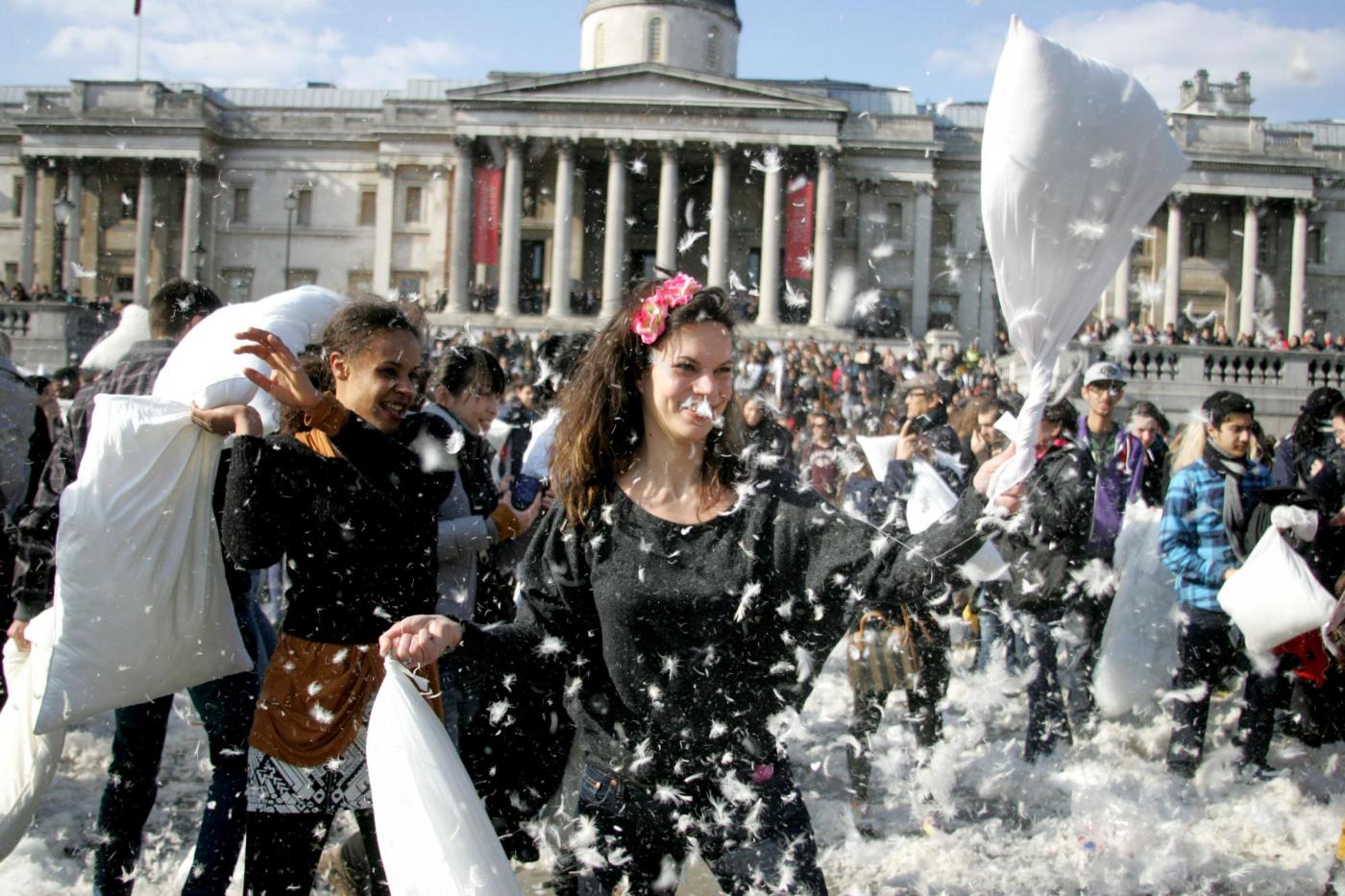 LONDRA – A Londra, migliaia di persone si sono riversate in Trafalgar Square per il Pillow Fight Day (“il giorno della battaglia dei cuscini” n.d.r). La stessa festa è andata in scena a Washington Square Park a New York.