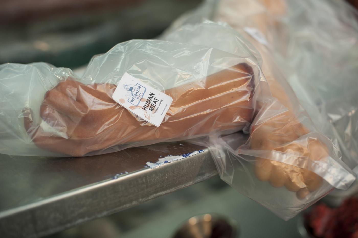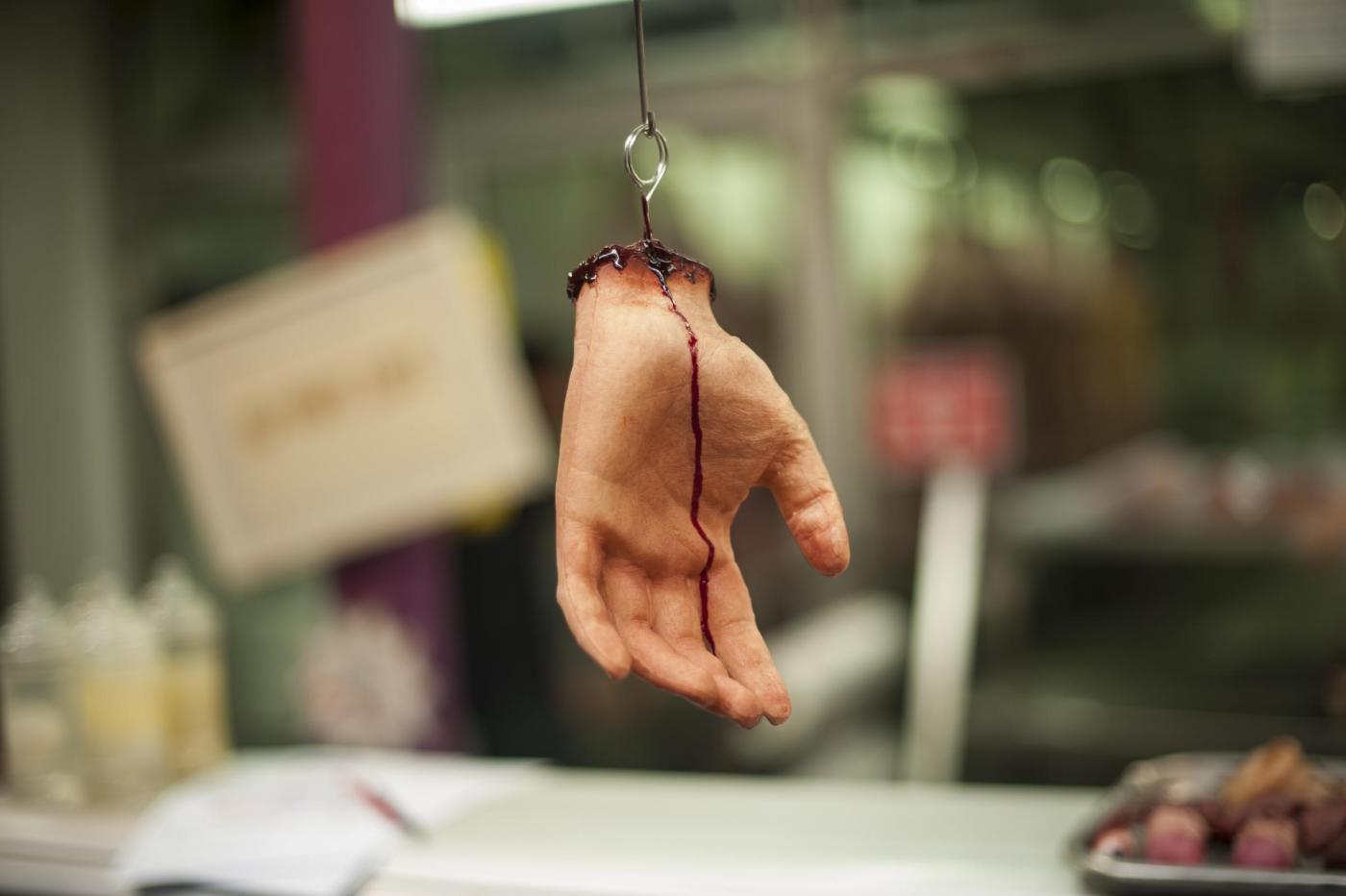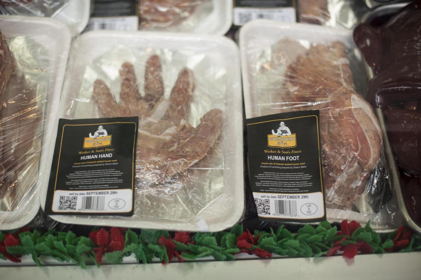 Nella macelleria, le massaie britanniche possono acquistare tagli di carne umana. Come si vede nella galleria, esposti sul bancone ci sono mani, lingue, dita, occhi, ed anche un intero corpo umano ricreato con bacon e salsicce. Ovviamente, dato che vendere carne umana è proibito, per chi non lo avesse capito si tratta solo di arte e pubblicità (foto Ap/LaPresse)
