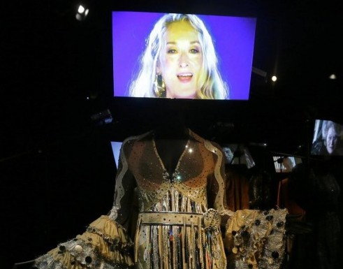 A costume designed by Ann Roth and used in the 2008 film Mamma Mia for the character Donna played by Meryl Streep is seen on display at the Hollywood Costume exhibition at the Victoria and Albert museum in London, Tuesday, Oct. 16, 2012. Streep is seen in the video display above the costume. The show at the Victoria and Albert Museum showcases more than one hundred movie costumes from a century of film-making. The exhibition opens to the public on Oct. 20, 2012 and run till 27 Jan. 2013.