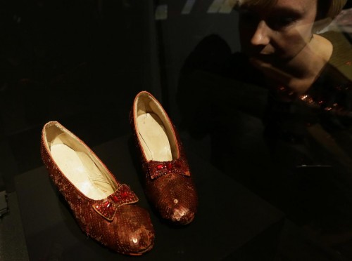 One of the four original pairs of 'Ruby Slippers' worn by Judy Garland playing Dorothy from the iconic 1939 Wizard of Oz film on view at the Hollywood Costume exhibition at the Victoria and Albert Museum in London, Tuesday, Oct. 16, 2012. The slippers are on loan from the Smithsonian National Museum of American History and are on display till Nov. 18, when they must return to the US, so that they are back in time for the Thanksgiving national holiday. The slippers were designed by MGM studios chief costume designer Adrian, who designed most of the costumes for the Wizard of Oz film. The show at the Victoria and Albert Museum showcases more than one hundred movie costumes from a century of film-making. The exhibition opens to the public on Oct. 20, 2012 and run till 27 Jan. 2013.