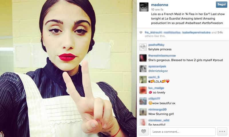 Lourdes, 17 anni, è protagonista di una recita scolastica con i compagni di scuola come tutti i ragazzi della sua età. La rappresentazione è della farsa di Feydeau “La pulce nell’orecchio”. La Regina del pop, a proposito della figlia scrive: “Sono molto orgogliosa di lei”.