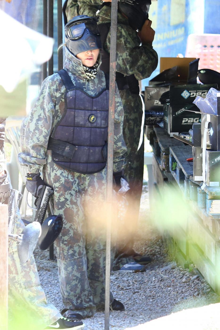 Nelle foto pubblicate da LaPresse, la Regina del Pop trascorre la giornata giocando a paintball, gioco di guerra il cui scopo è eliminare l’avversario colpendolo con delle palline di gelatina riempite di vernice colorata.