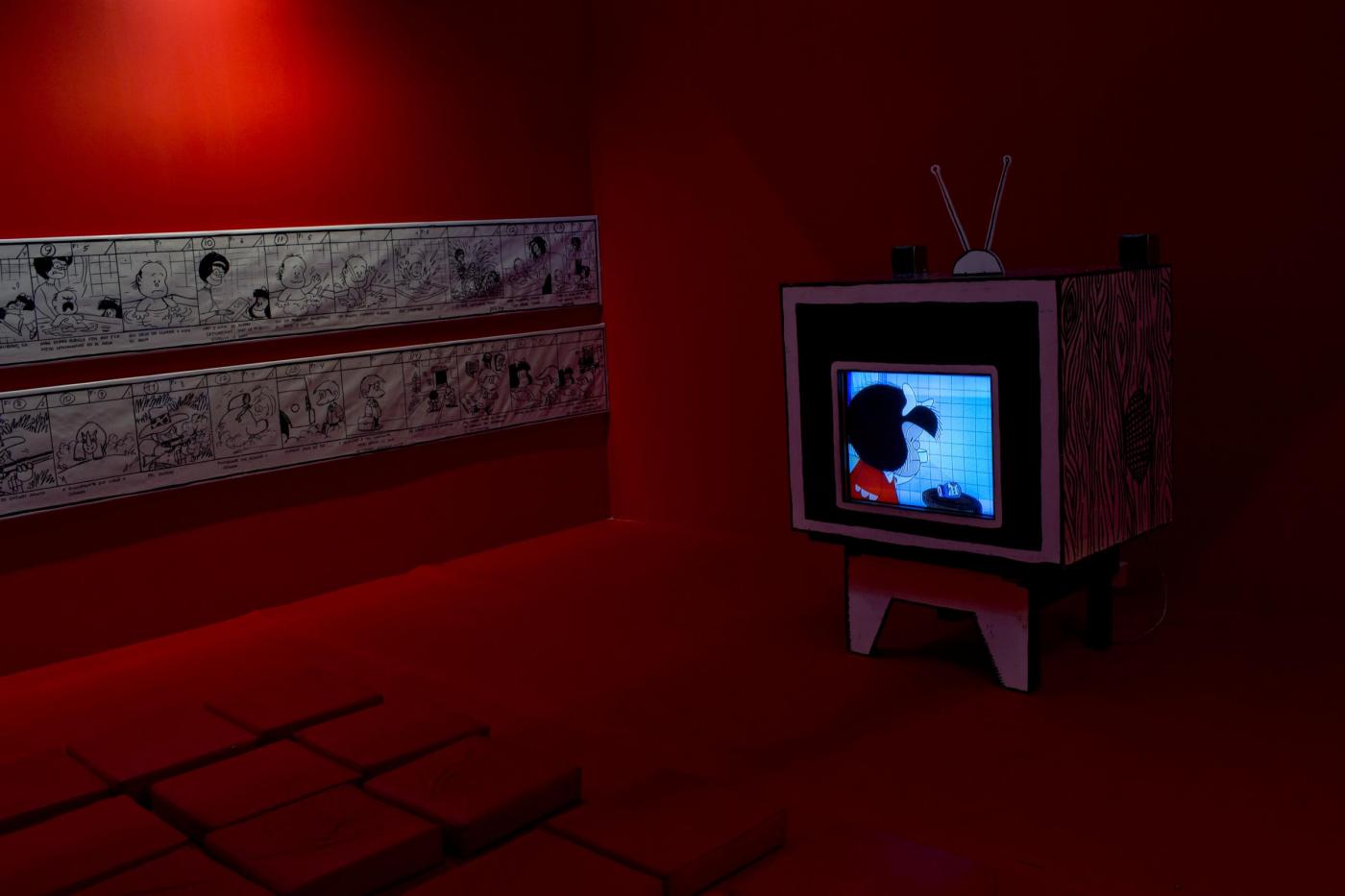 A television plays Mafalda cartoons as part of of the exhibition “El mundo según Mafalda,” in Buenos Aires, Argentina, Monday, Sept. 15, 2014. Argentine cartoonist Joaquin Salvador Lavado, better known as Quino is the creator of the comic strip Mafalda , that will celebrate 50 years since its first appearance on September 29, 2014.