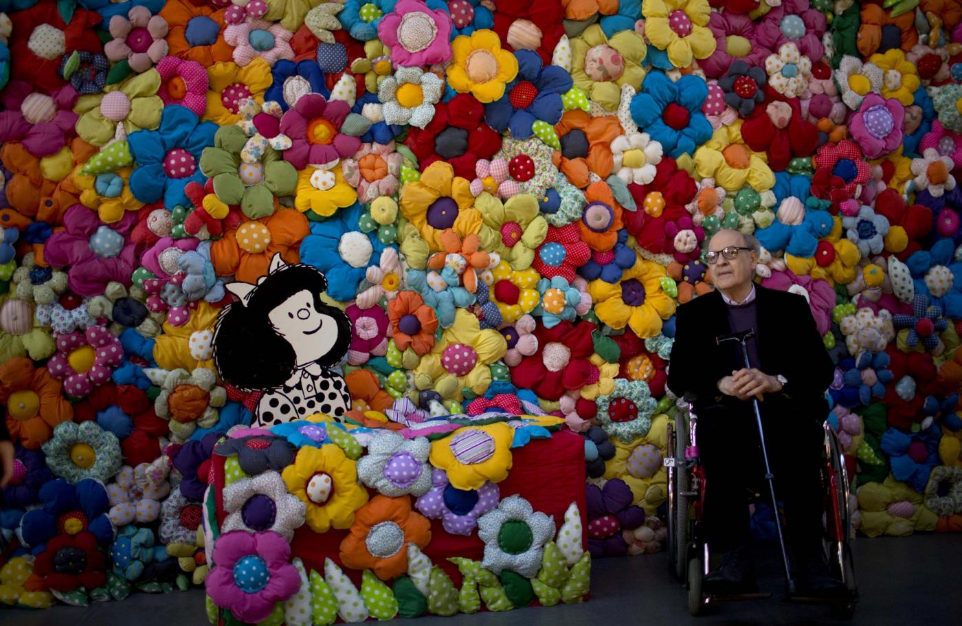 Argentine cartoonist Joaquin Salvador Lavado, better known as Quino, creator of the comic character Mafalda poses for a picture during the inauguration of the exhibition “El mundo según Mafalda,” in Buenos Aires, Argentina, Monday, Sept. 15, 2014. The comic strip Mafalda celebrates 50 years since it first ran on September 1964. (AP Photo/Natacha Pisarenko)