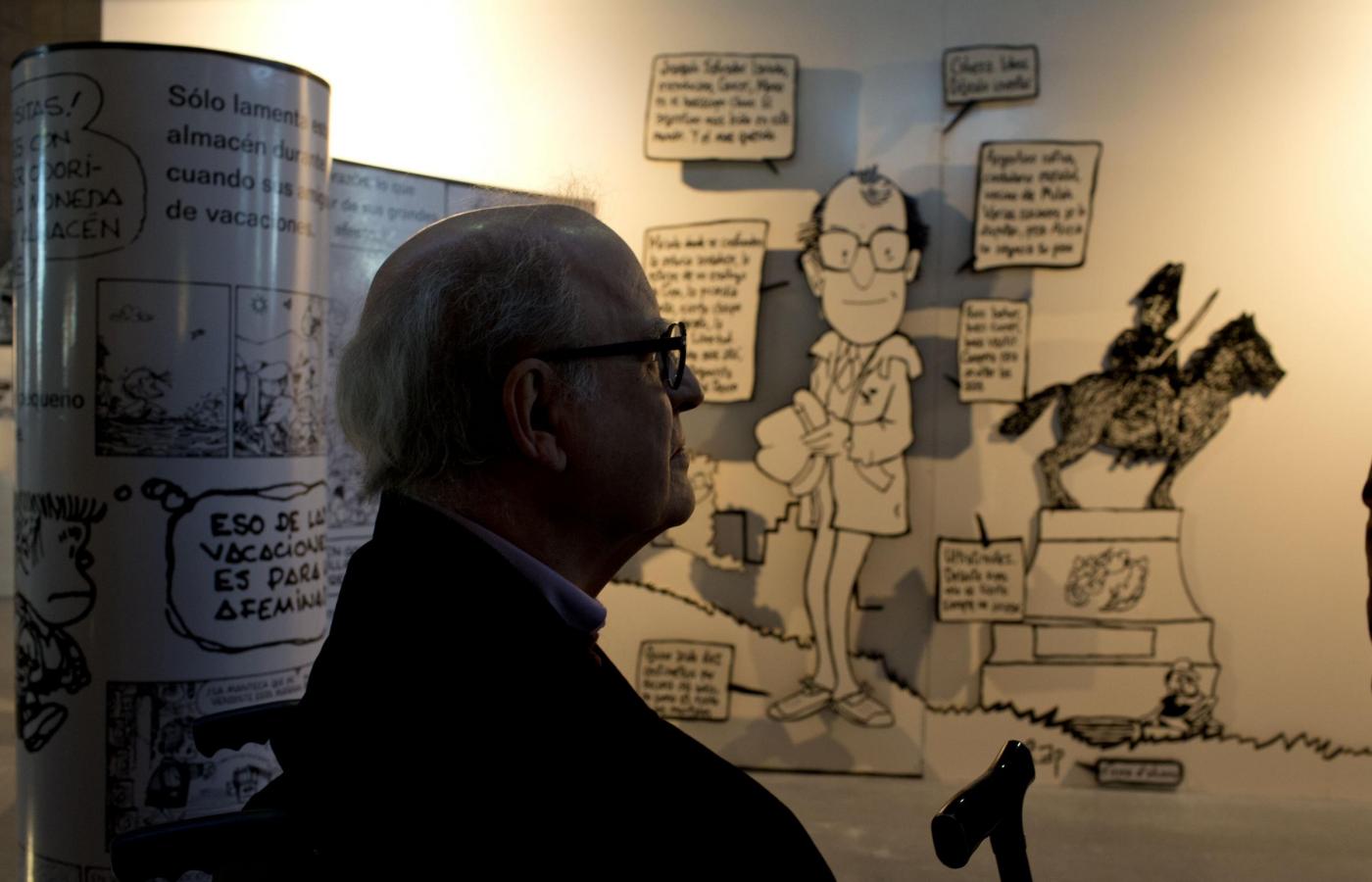Argentine cartoonist Joaquin Salvador Lavado, better known as Quino, creator of the comic character Mafalda talks to friends during the inauguration of the exhibition “El mundo según Mafalda,” in Buenos Aires, Argentina, Monday, Sept. 15, 2014. The comic strip Mafalda celebrates 50 years since it first ran on September 1964. (AP Photo/Natacha Pisarenko)
