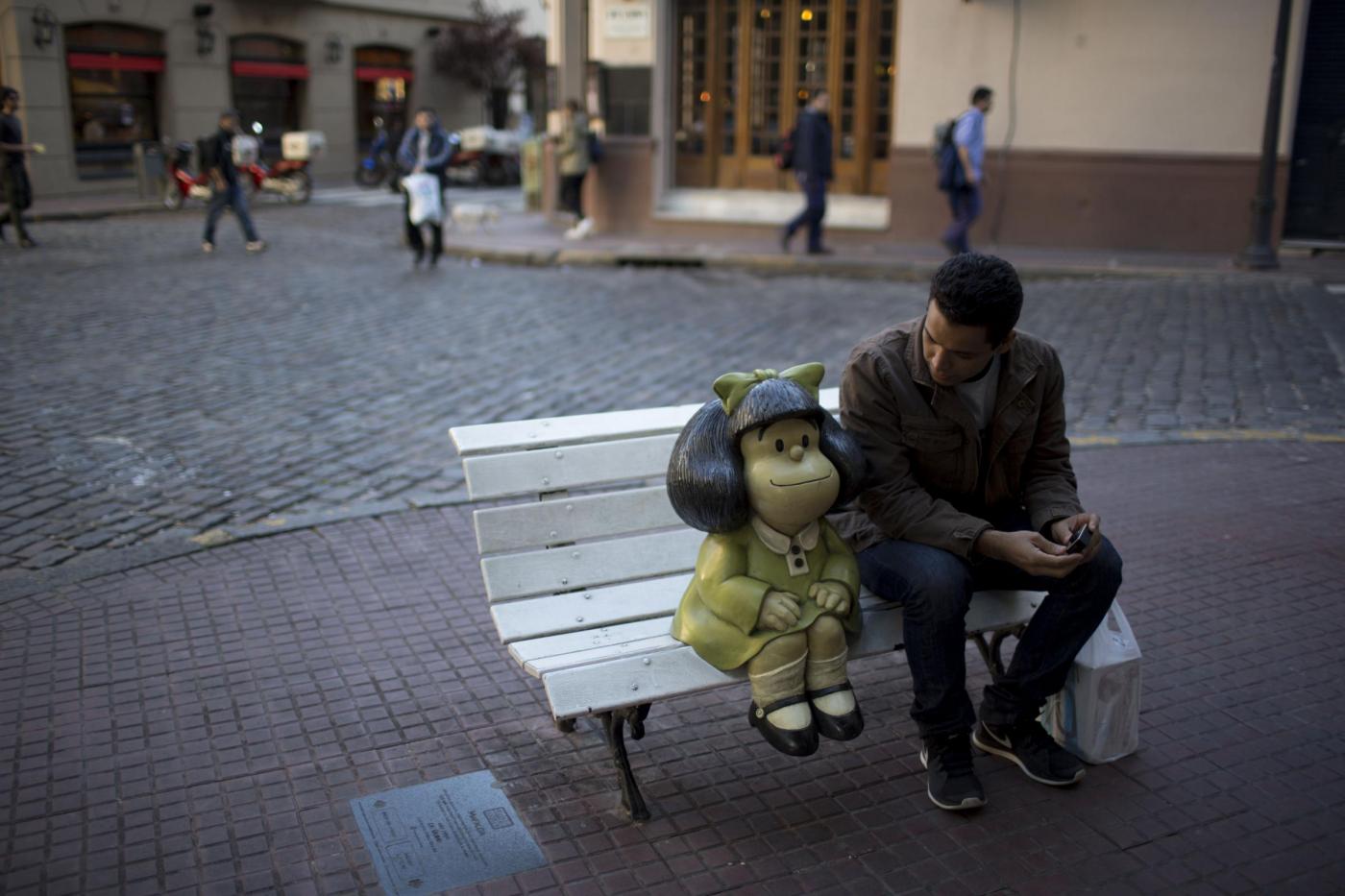 A tourist sits on a bench beside the statue of comic strip characeter Mafalda in Buenos Aires, Argentina, Monday, Sept. 15, 2014. Argentine cartoonist Joaquin Salvador Lavado, better known as Quino is the creator of the comic strip Mafalda , that will celebrate 50 years since its first appearance on September 1964. (AP Photo/Natacha Pisarenko)