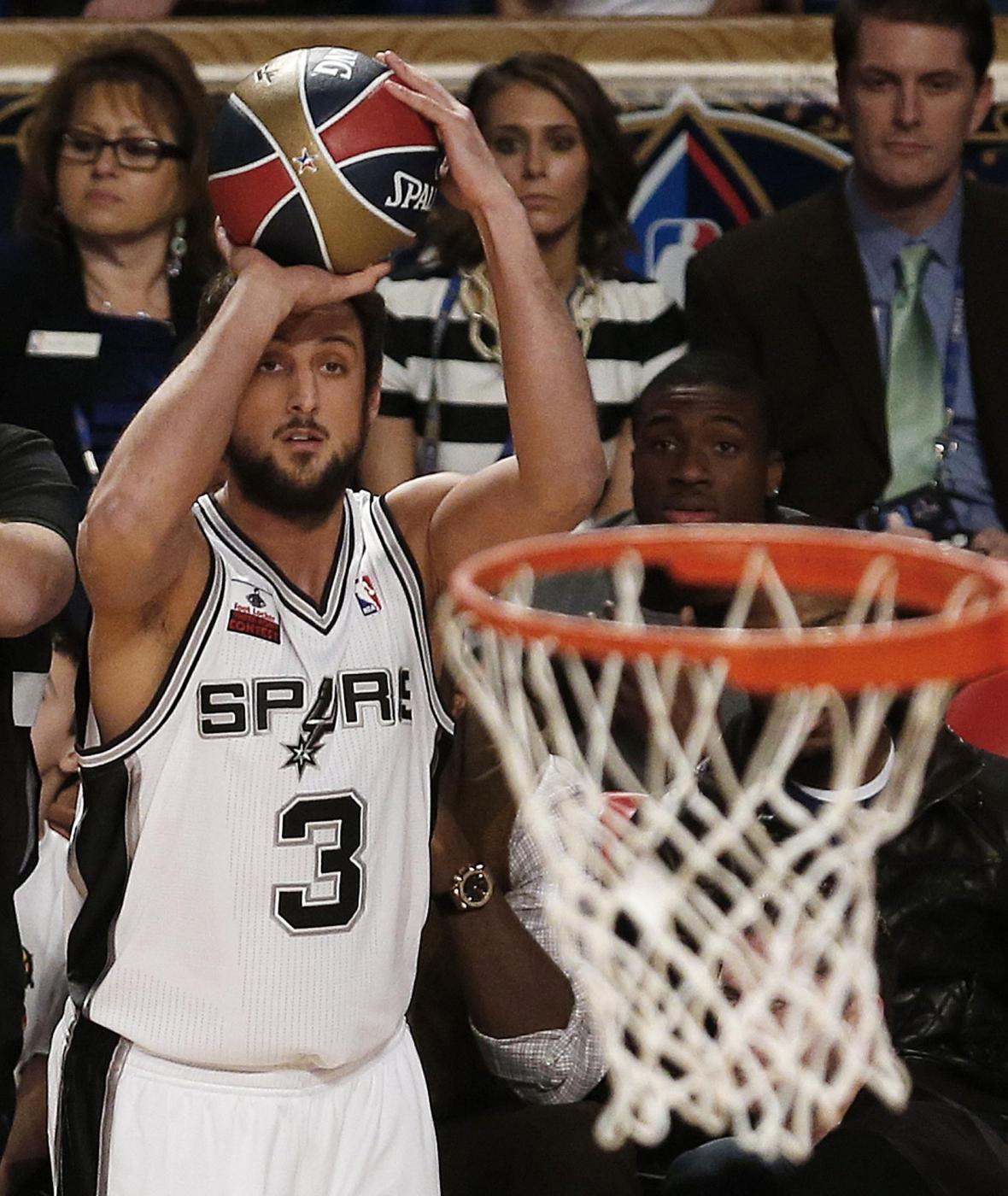 Marco Belinelli of the San Antonio Spurs shoots during the three-point contest during the skills competition at the NBA All Star basketball game, Saturday, Feb. 15, 2014, in New Orleans. (AP Photo/Bill Haber)