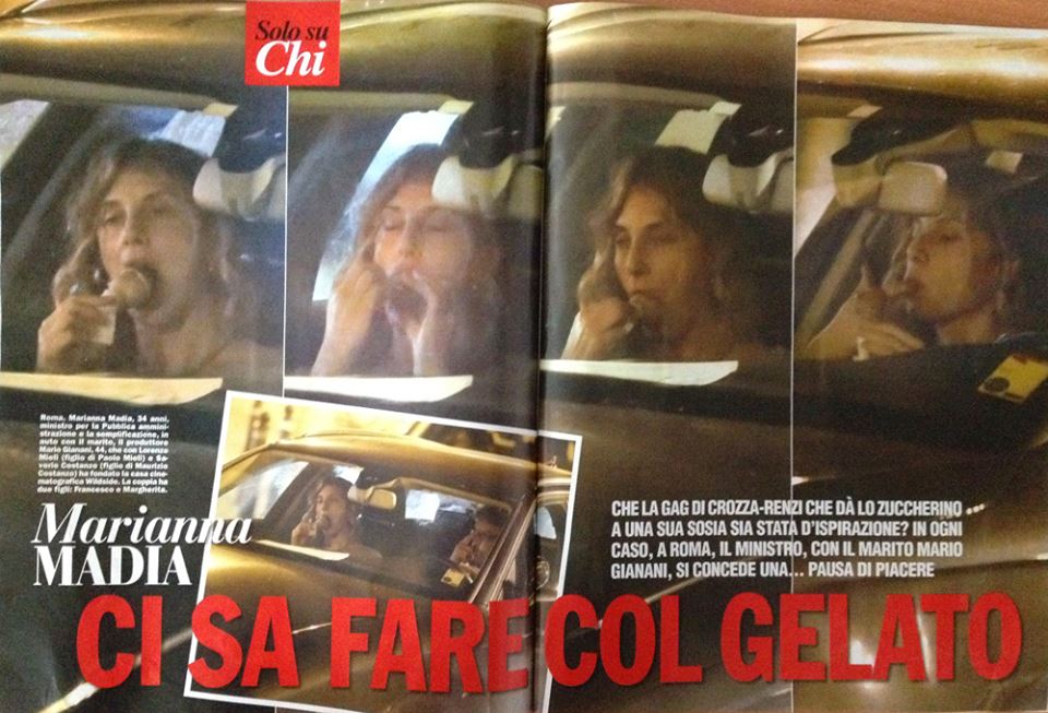 ROMA – Tutti i gelati non sono uguali ma Alfonso Signorini non sembra saperlo. Così spera di riparare l’irreparabile con una scusa apparsa ancora più irreparabile. Il fatto è questo: Marianna Madia, Ministro per la Pubblica Amministrazione e la Semplificazione, è stata immortalata dai fotografi del magazine “Chi” mentre era in macchina con il marito a gustarsi un banalissimo gelato. Non sapeva, la Madia, che quel gelato sarebbe divenuto un titolone per “Chi”, tanto allusivo quanto squallido: “Il ministro ci sa fare con il gelato” con tanto di didascalia “Con il marito si concede… una pausa di piacere”. Un articoletto che non è andato a genio ai più. Dal web all’Ordine dei giornalisti lombardi si è scatenata una vera e propria polemica. Scrive Maria Luisa Agnese sul Corriere della Sera: