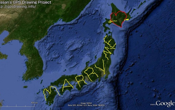 TOKYO – L’artista giapponese “Yassan” ha voluto scrivere alla compagna quanto grande fosse il suo amore. Ma invece che utilizzare un muro, l’artista ha deciso di scrivere “Marry Me” usato come lavagna un Gps.