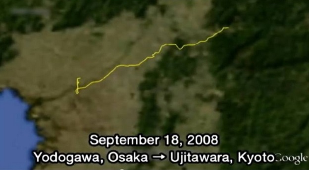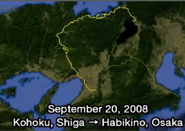 L’obiettivo finale era farle questa incredibile proposta di matrimonio, senza’altro la più grande e originale della storia. L’uomo ha coperto esattamente 7163 chilometri lungo tutto il Giappone. Per compiere la sua opera, Takahashi ha utilizzato ovviamente un Gps ed ha attraversato il paese a piedi, in traghetto, in auto e in bici.