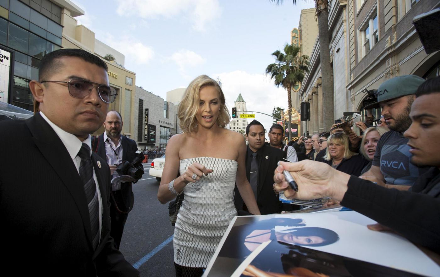 Cast member Charlize Theron signs autographs at the premiere of "Mad Max: Fury Road" in Hollywood, California May 7, 2015. The movie opens in the U.S. on May 15. REUTERS/Mario Anzuoni