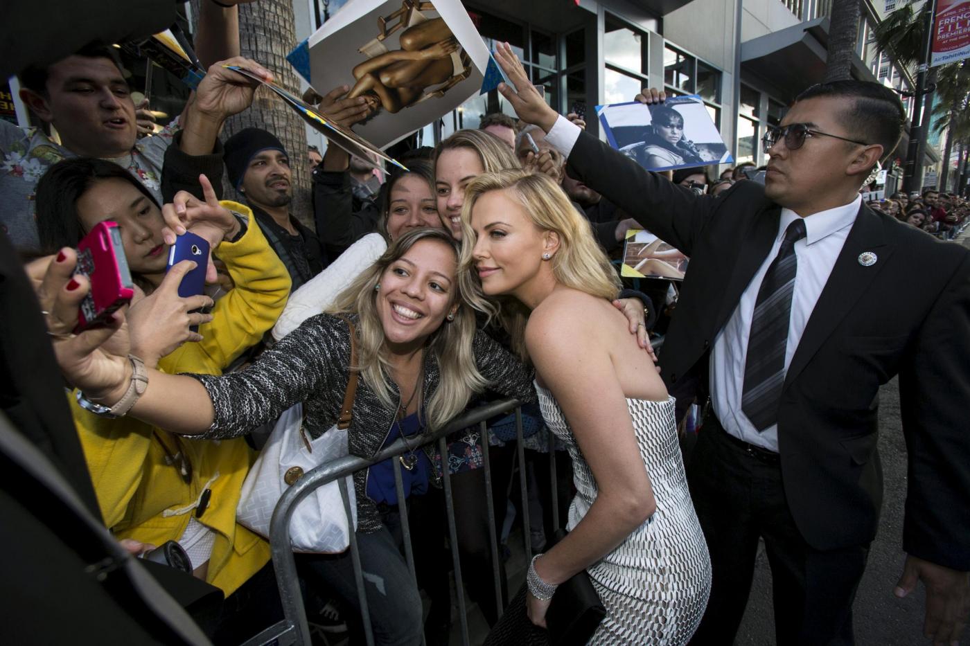 Cast member Charlize Theron poses with fans at the premiere of "Mad Max: Fury Road" in Hollywood, California May 7, 2015. The movie opens in the U.S. on May 15. REUTERS/Mario Anzuoni