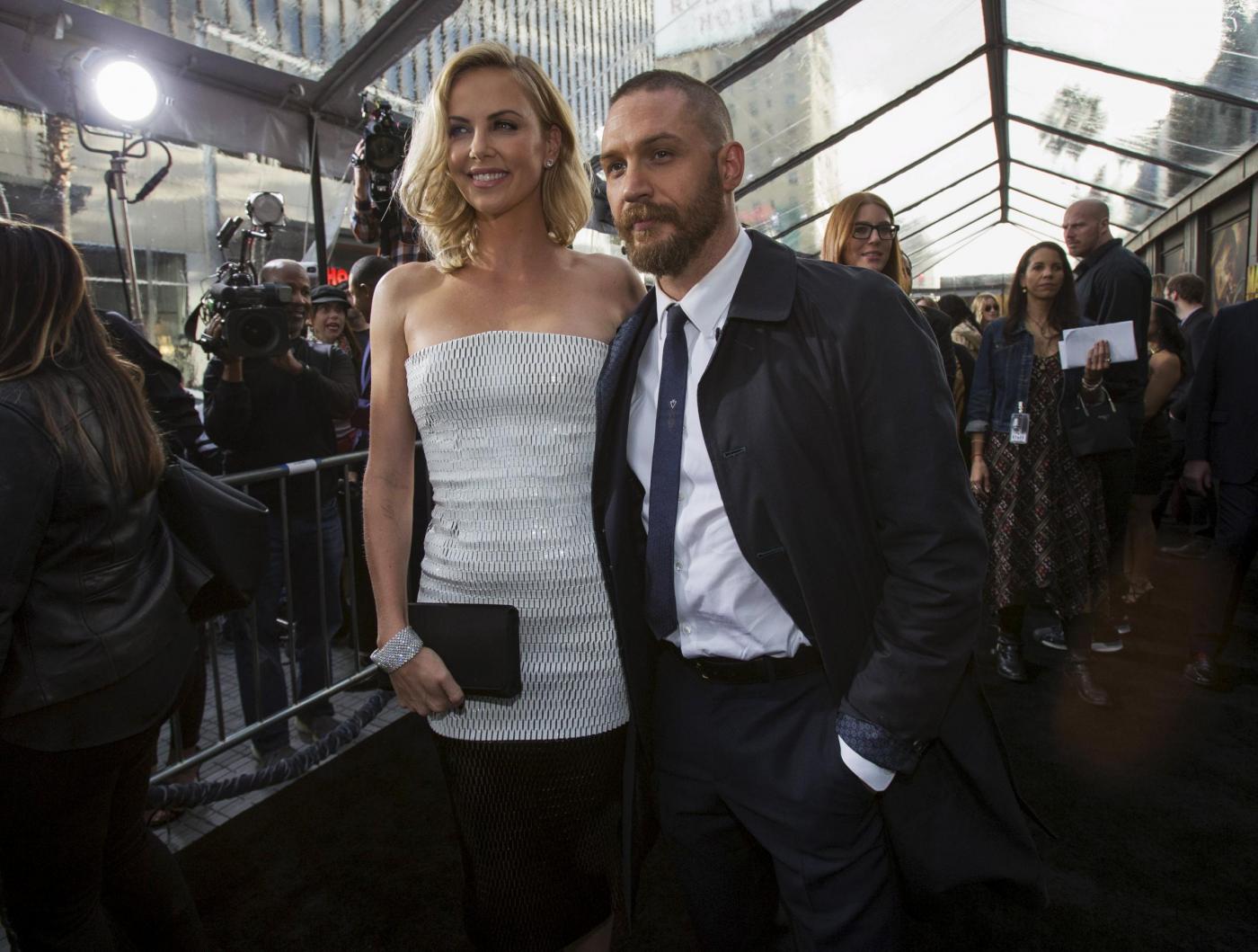 Charlize Theron e Tom Hardy Cast members Charlize Theron and Tom Hardy pose at the premiere of "Mad Max: Fury Road" in Hollywood, California May 7, 2015. The movie opens in the U.S. on May 15. REUTERS/Mario Anzuoni