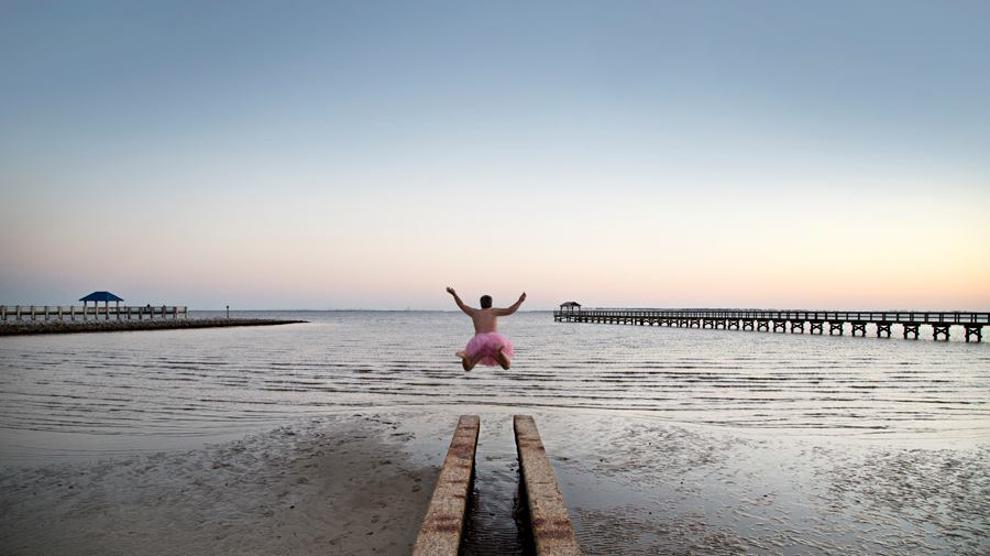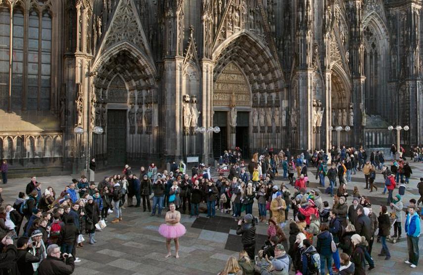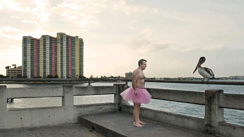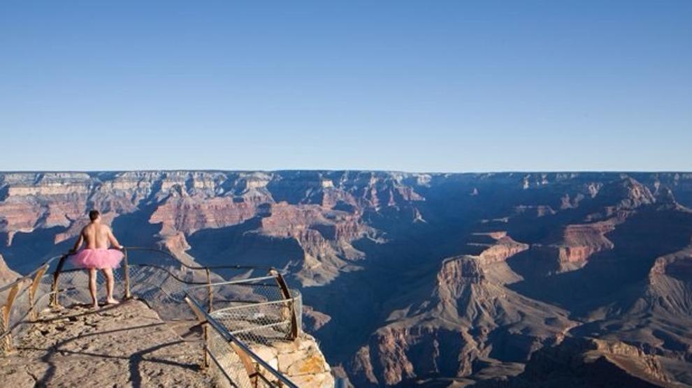 Carey ha cominciato a viaggiare nel 2003: in quell’anno a sua moglie venne diagnosticato un cancro. Da qui l’idea bizzarra, nata solo con lo scopo di far sorridere la moglie. Le immagini sono state scattate in giro per il mondo e ritraggono il fotografo vestito solo di un tutù rosa.