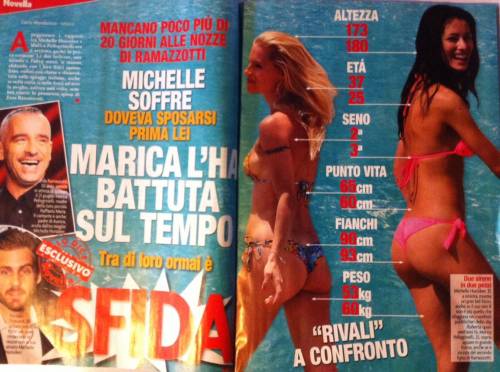 ROMA – Una bionda e l’altra mora. Una attende la data di matrimonio per le nozze con Tomaso Trussardi, l’altra è in procinto di sposarsi con Eros Ramazzotti. Michelle Hunziker e Marica Pellegrinelli: due donne bellissime messe spietatamente a confronto da “Novella2000” che nel nuovo numero dedica due intere pagine alle showgirl.