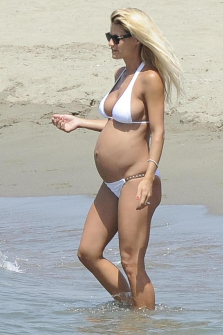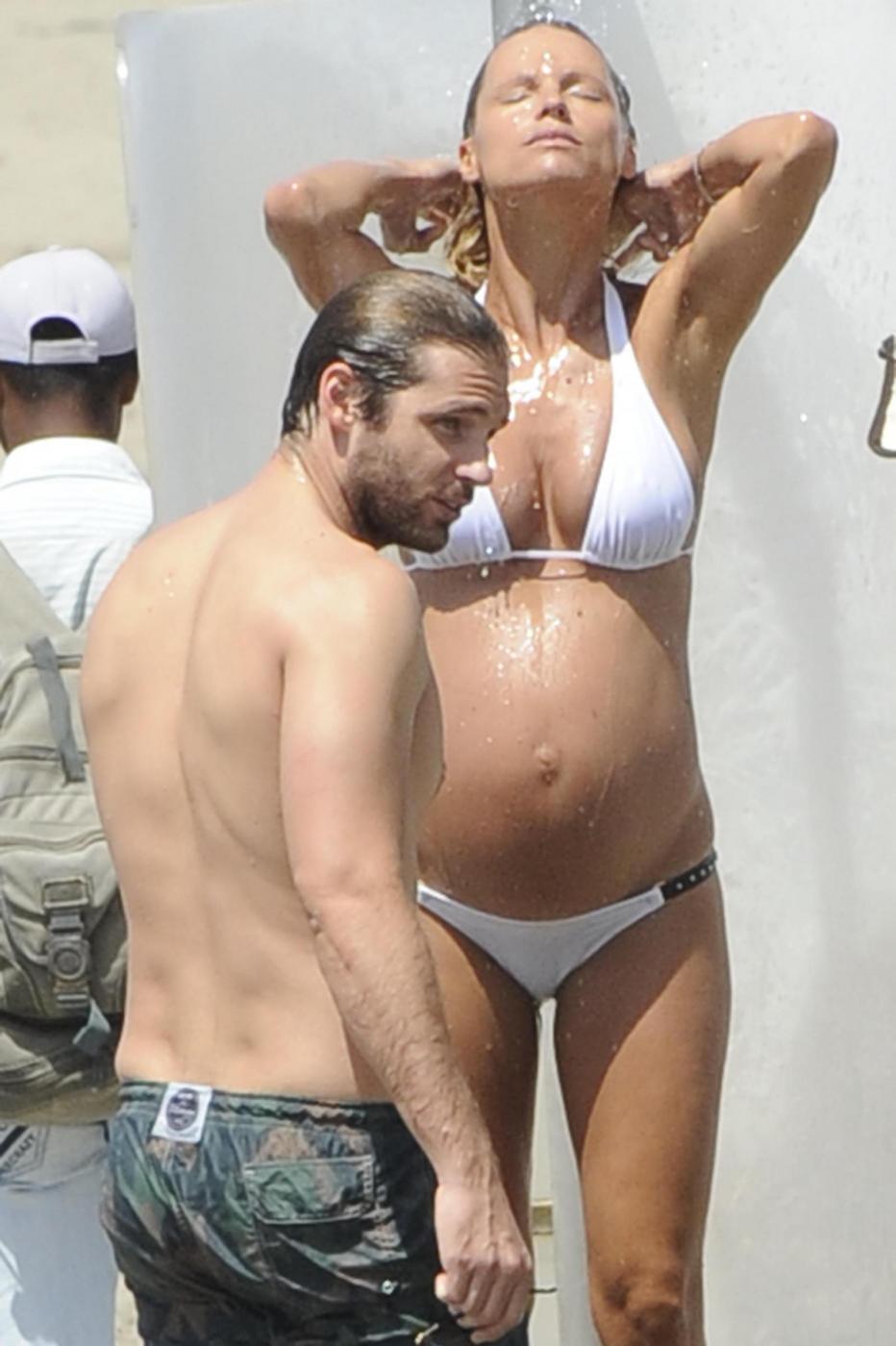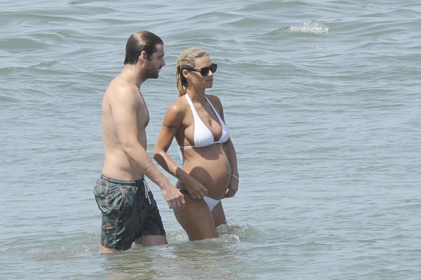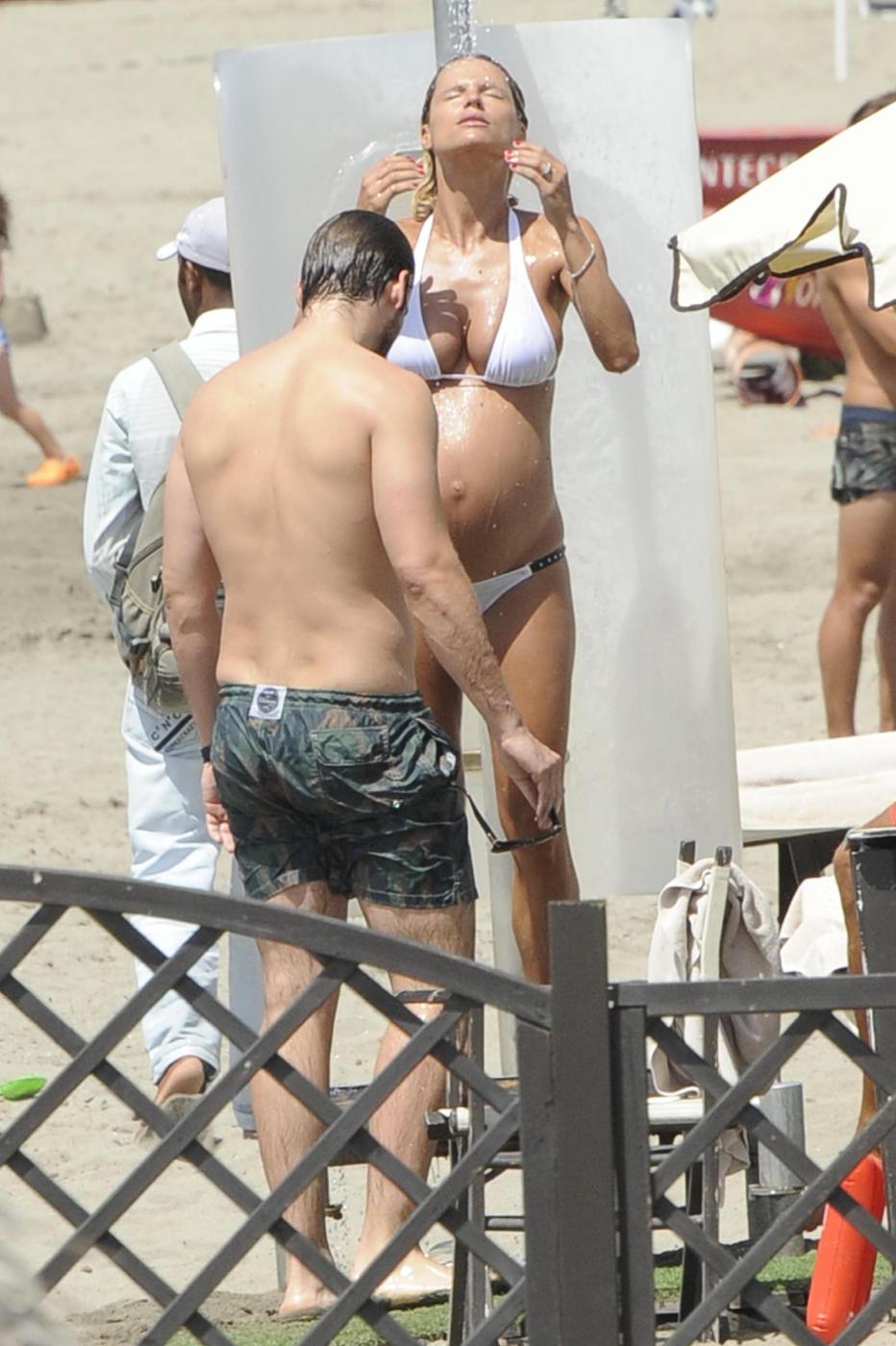 La showgirl svizzera, sulla spiaggia della nota località toscana appare coperta soltanto da un malizioso bikini bianco, capelli sciolti e grandi occhiali da sole che toglie solo per concerdesi una doccia rinfrescante. Un bagno rinfrescante e qualche coccola in attesa del lieto evento, previsto tra un paio di mesi.