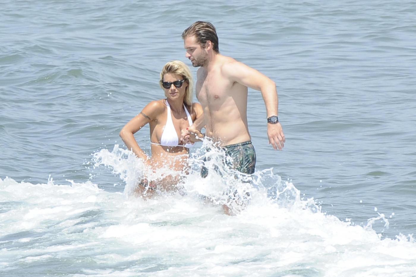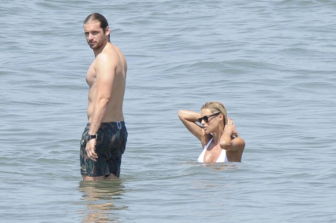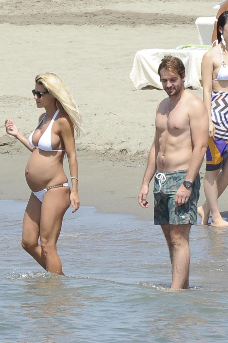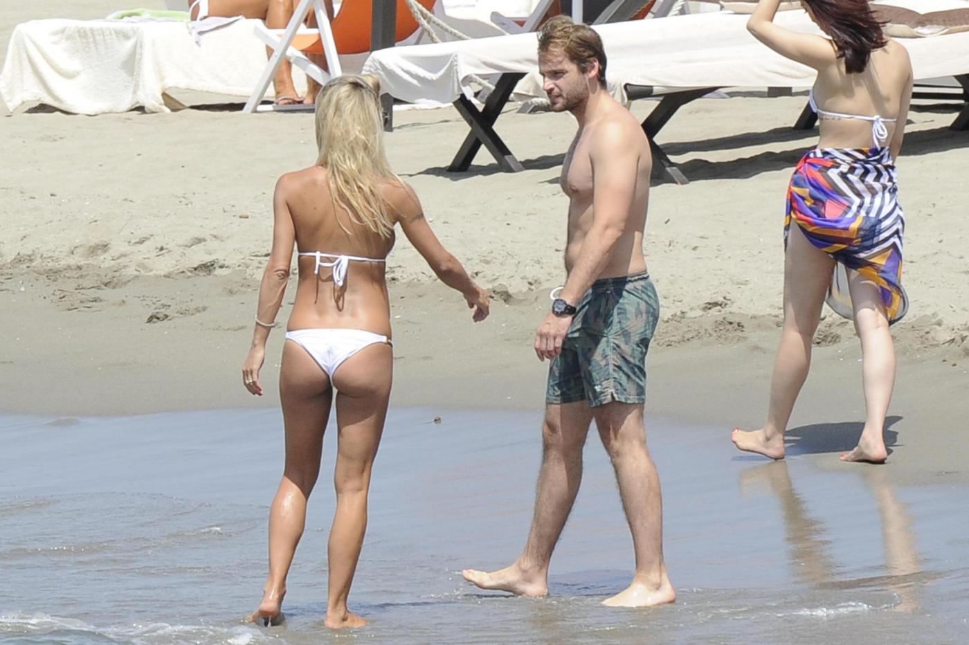 La showgirl svizzera, sulla spiaggia della nota località toscana appare coperta soltanto da un malizioso bikini bianco, capelli sciolti e grandi occhiali da sole che toglie solo per concerdesi una doccia rinfrescante. Un bagno rinfrescante e qualche coccola in attesa del lieto evento, previsto tra un paio di mesi.
