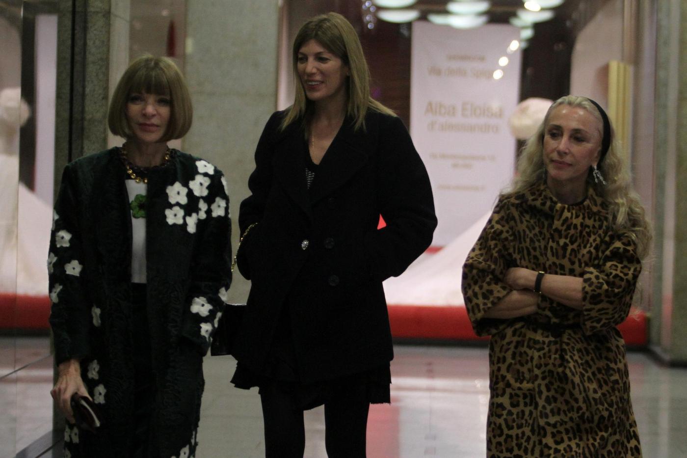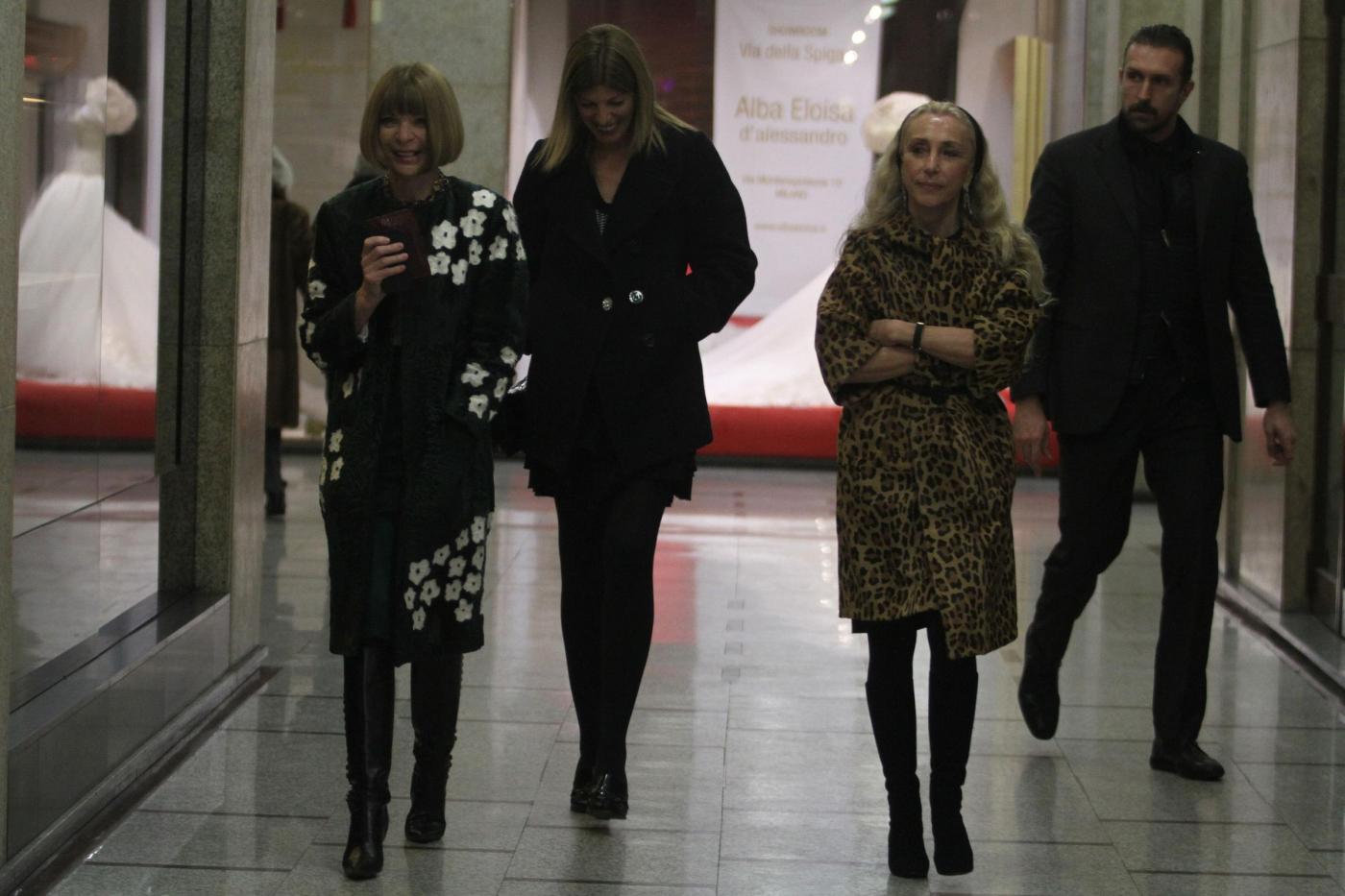 Le due severe critiche stanno seguendo in questi giorni la settimana della moda milanese dopo aver preso parte alle precedenti fashion week tra Londra e New York. Durante una tranquilla passeggiata in Via Monte Napoleone, la Wintour viene fotografata con un cappottino scuro impreziosito da disegni floreali. La collega italiana opta invece per un maxi cappotto animalier e una larga fascia nera tra i capelli (foto LaPresse)