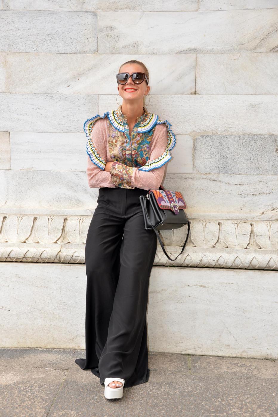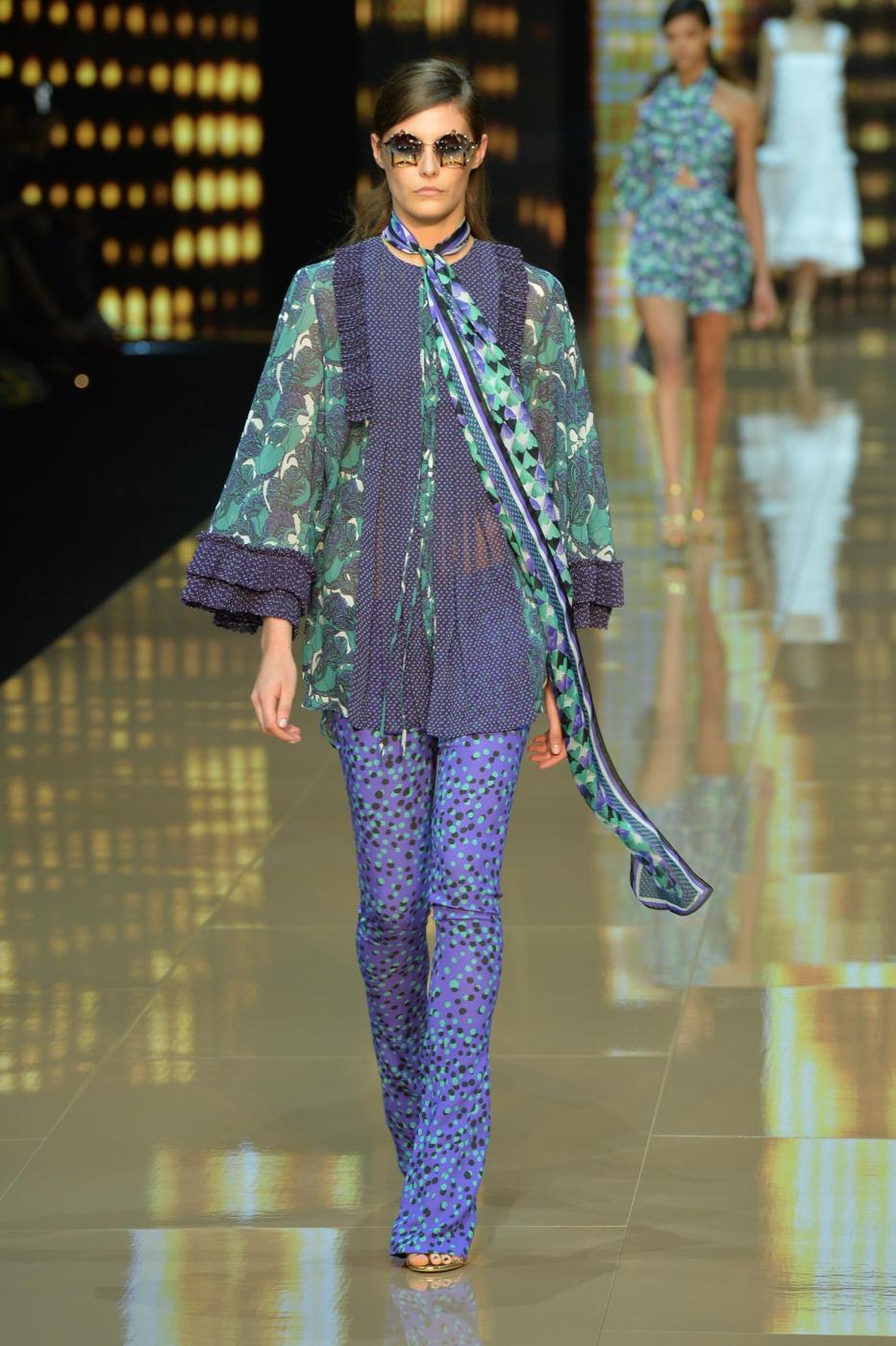 I colori vanno dal verde, al viola, al giallo, all’azzurro. Lo stile “hippie chic” scelto dallo stilista toscano ricorda quello degli anni Settanta, proposto d’altra parte anche da Gucci per la prossima primavera.