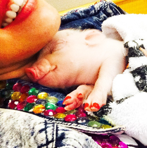Sebbene sia in giro per il suo Bangerz tour, la 21enne trova il tempo per coccolare il suo nuovo porcellino. Lo bacia e lo abbraccia, tenendolo fasciato come fosse un neonato. Istinto materno? Difficile dirlo. Certo è si mostra estremamente affettuosa nei confronti del quadrupede, che volente o nolente, è già finito in rete.